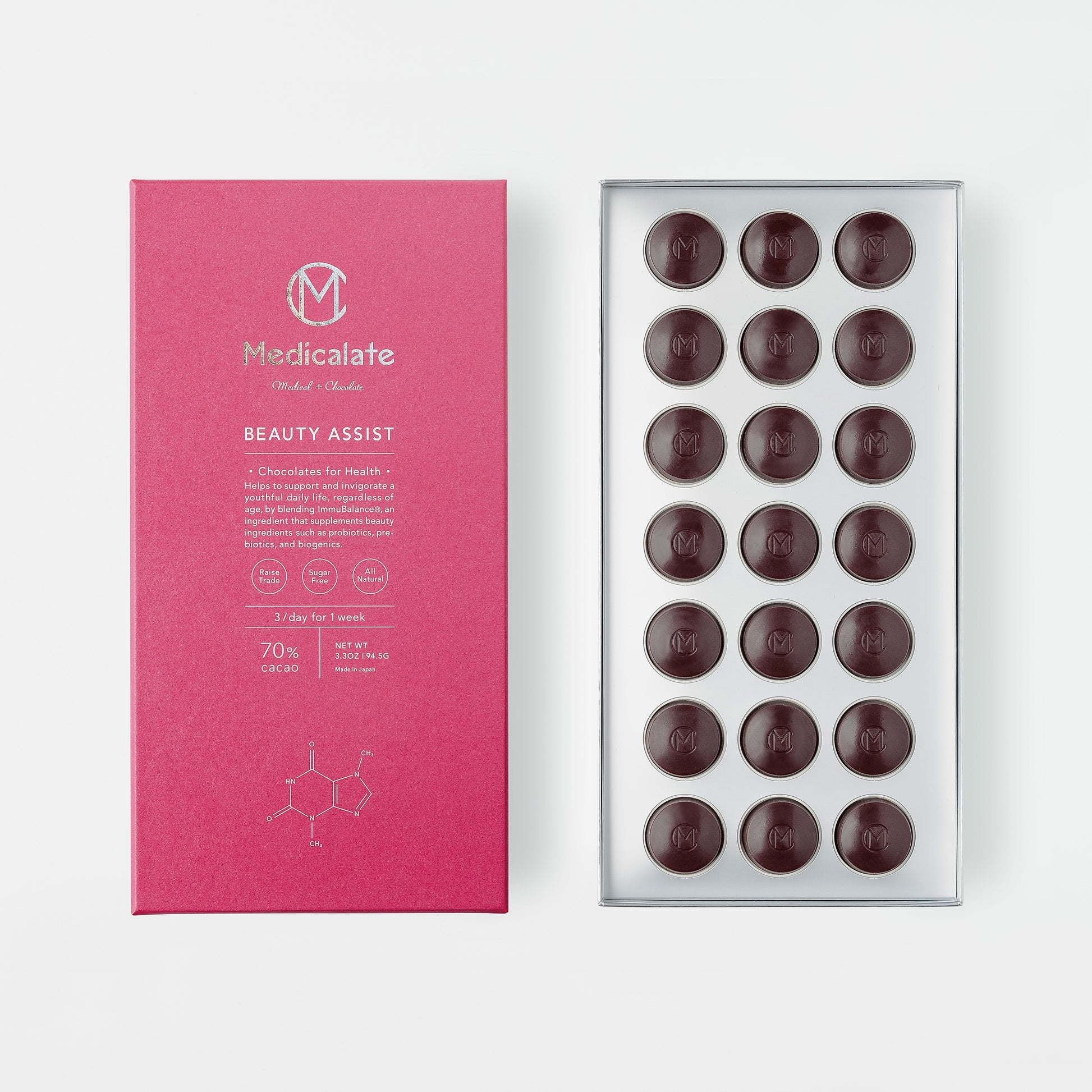 アリバ種カカオが持つジャスミンのような華やかな芳香を、カミーノベルデ独自の技術で最大限に引き出しました。内側からの美しさを支える特許成分ImmuBalance®を配合。カカオの生命力をダイレクトに感じる、医学的知見に基づいた一粒です。